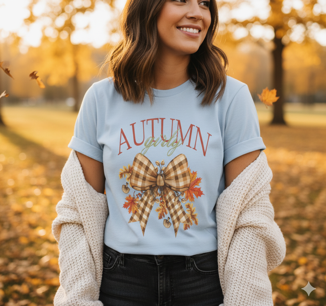 Celebrate your love for fall fashion with this Autumn Girly Tee, featuring a chic gingham bow surrounded by autumn leaves and acorns. Soft, feminine, and full of seasonal charm, this design is perfect for hayrides, cozy photoshoots, or sipping cider in style.