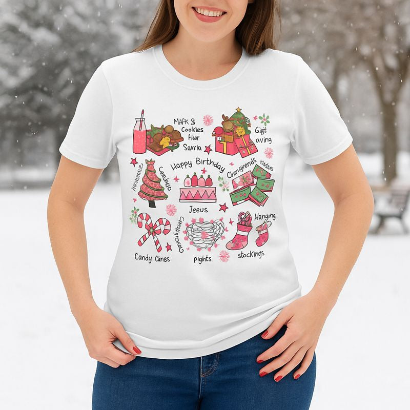 Celebrate every little joy of the holiday season with this playful Christmas checklist tee! From milk & cookies to stockings and lights, this fun design captures all the festive favorites—plus a sweet birthday shoutout to Jesus.
