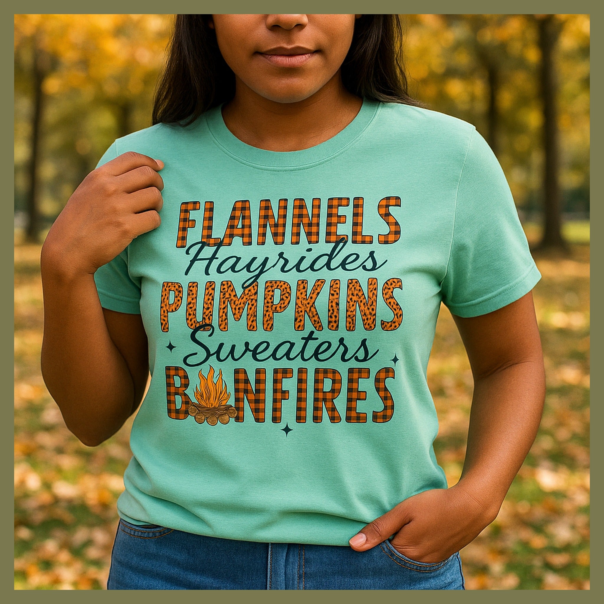 Capture the essence of autumn in one cozy graphic with the Fall Checklist Bonfire Tee. This design features a list of seasonal must-haves—flannels, hayrides, pumpkins, sweaters, and bonfires—styled in fun plaid and leopard-print lettering with a cute campfire illustration. It’s the perfect go-to shirt for crisp outdoor adventures or cuddling up by the fire. Whether you're at a pumpkin patch, sipping cider, or heading to a fall festival, this tee brings all the warm, happy vibes of the season.